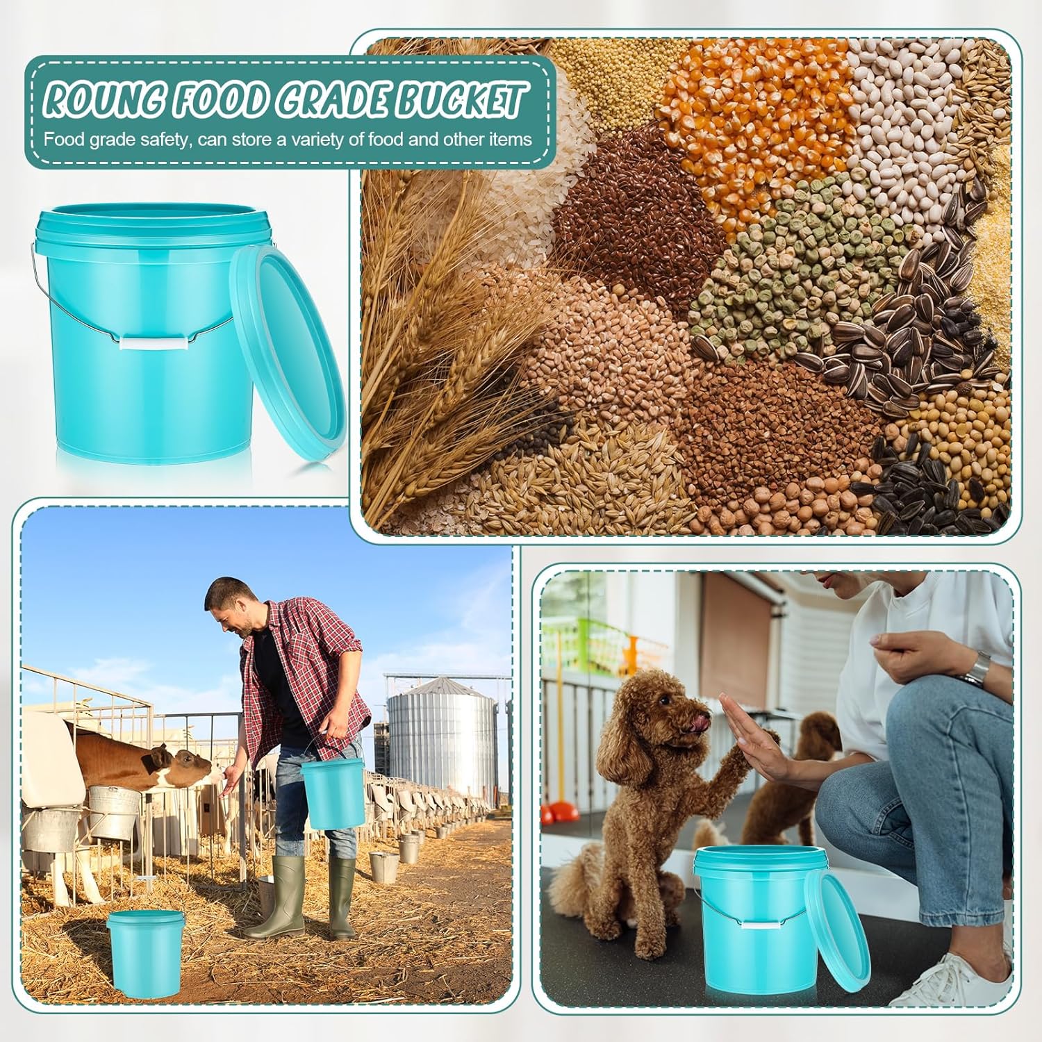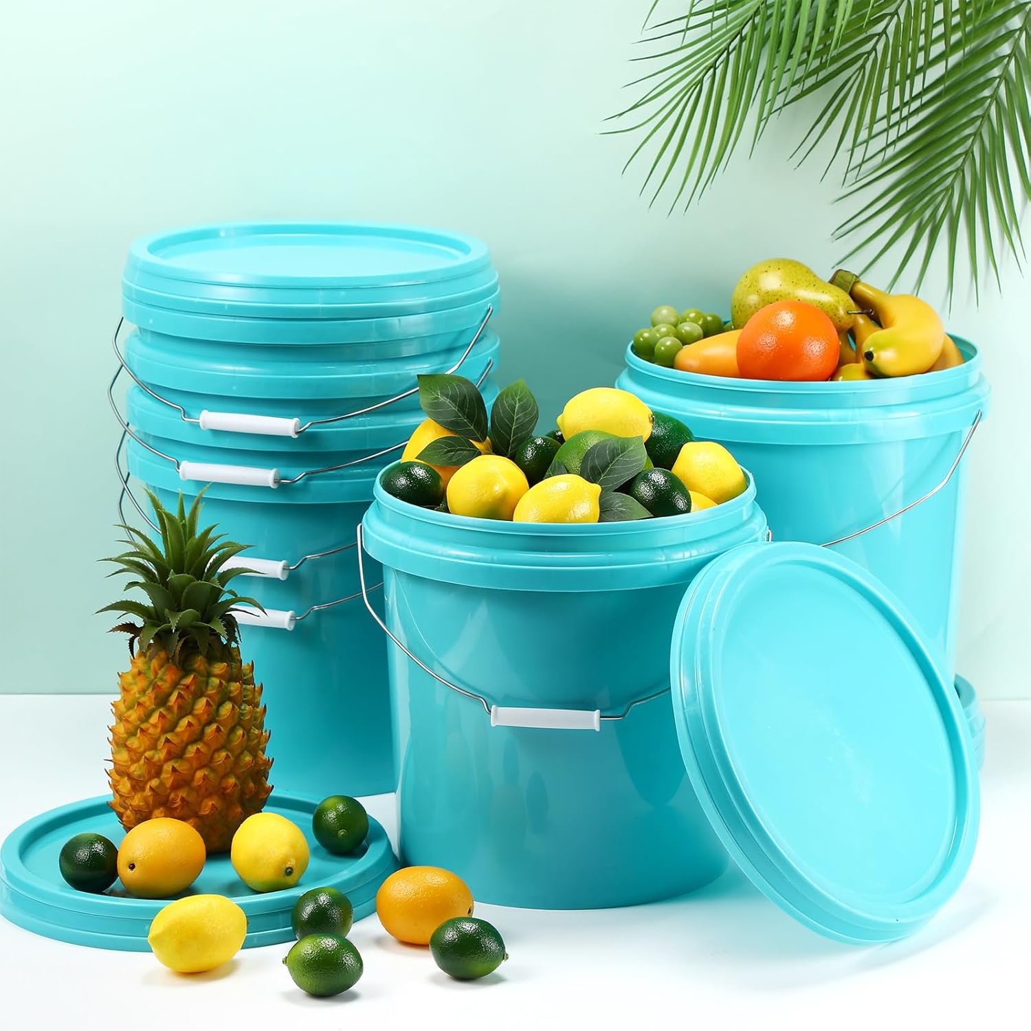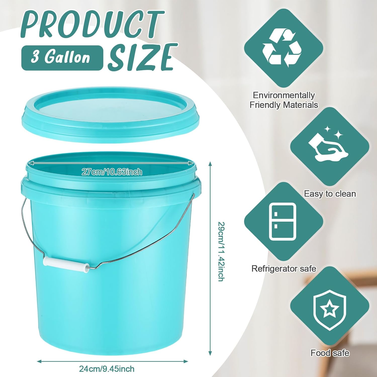 Features: Designed for convenience: These plastic food pails are lightweight yet sturdy, enabling you to carry it around easily. Whether you need to transport garden soil for your plants, carry water to remote areas in your home, or simply move things around, our bucket is your best choice. When not in use, these buckets can be seamlessly nested together, optimizing storage and saving you precious space. Easy to clean: The plastic pail with lid and handle features smooth surface, ensuring that it's easy to clean. In scenarios where the bucket is applied to store different contents sequentially, its seamless cleaning ensures cross contamination is avoided. Specifications: Material: PP plastic, metalColor: lake blueSize: about 9.45 inches/ 24 cm in bottom diameter, 10.43 inches/ 27 cm in top diameter, 11.42 inches/ 29 cm in heightCapacity: about 3.2 gallon/ 12 lPackage includes: 6 x Bucket with lid and handleNotes: Manual measurement, please allow slight errors on size. The color may exist a slight difference due to different screen displays.