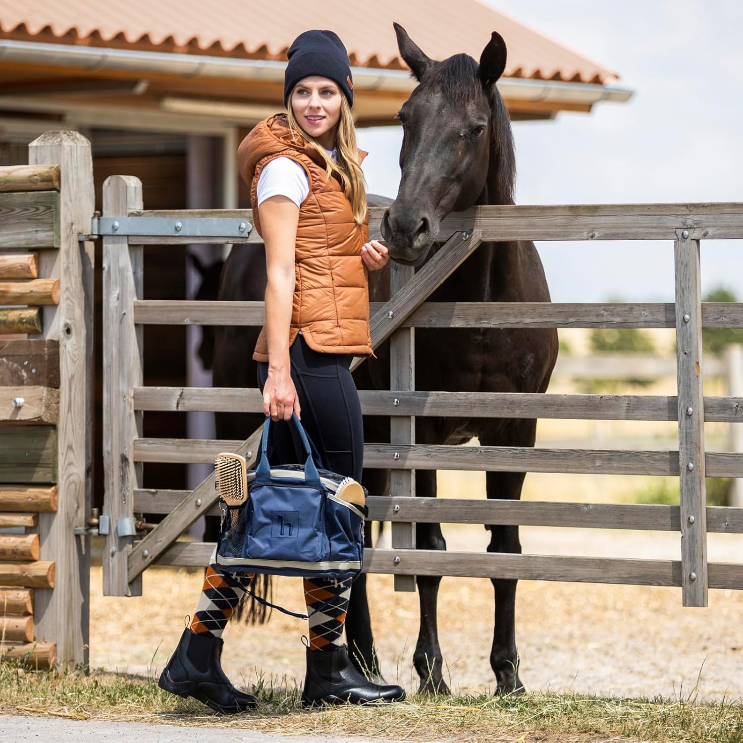 Practical grooming bag for your stable essentials. The Horze Sandnes grooming bag is made to fit all of your grooming supplies. The big compartment closes with a draw string. The outer pockets offer extra room for bottles or small accessories. Carry it on two short handles or the long shoulder strap.