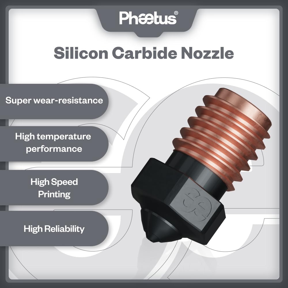 SILICON CARBIDE NOZZLE Every Material, No Compromise. From normal PLA to PEEK, even to Carbon Fiber reinforced materials, Silicon Carbide Nozzle could meet all the printing requirements of any material.