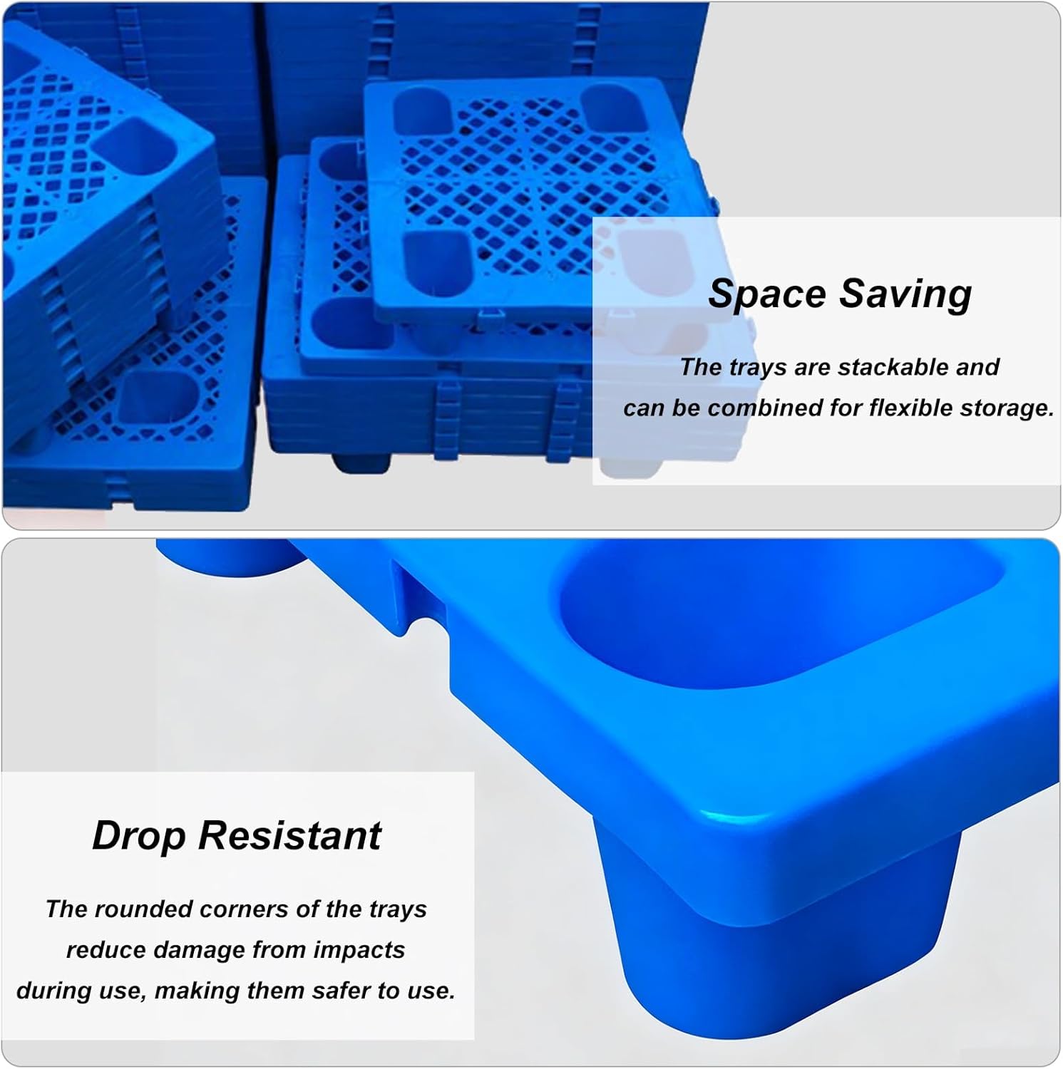 Product Details:Material: HDPE (High-Density Polyethylene)This product is made of high-density HDPE (High-Density Polyethylene), possessing excellent toughness and impact resistance, ensuring durability and resistance to breakage.Its superior resistance to high and low temperatures (-40℃ to 120℃) makes it suitable for various environments.The material itself is odorless, meeting the needs of various scenarios.Product Details:1. The pallet bottom features a reinforced rib design with uniform wall thickness and high compressive strength. The pallet is integrally molded without seams, ensuring stable load-bearing capacity of up to 300-500kg, making it durable.2. Pallets of the same size can be freely spliced together to easily form the required dimensions, perfectly suitable for large-scale deployment in warehouses, factories, etc. For warehouse or factory organization, the pallets can also be disassembled and stacked for storage, saving space.3. The product surface features a uniformly distributed grid design, which not only effectively prevents goods from sliding but also makes cleaning and drainage easier, effectively preventing goods from getting wet.4. The four corners of the pallet are rounded to prevent bumps and knocks during handling, making it safer to use and reducing wear and tear, thus extending its lifespan.5. This is a multi-functional pallet, widely applicable to various scenarios such as warehouse cargo pallets, cold storage mats, moisture-proof and elevated household items (4-inch), and livestock farm floor mats.Colors: Blue, Black.Dimensions:40x30x10CM/16x12x4IN, Static Load: 300kg;40x40x10CM/16x16x4IN, Static Load: 500kg;50x30x10CM/20x12x4IN, Static Load: 500kg;50x40x10CM/20x16x4IN, Static Load: 500kg;50x50x10CM/20x20x4IN, Static Load: 500kg;60x40x10CM/24x16x4IN, Static Load: 500kg;60x50x10CM/24x20x4IN, Static Load: 500kg.